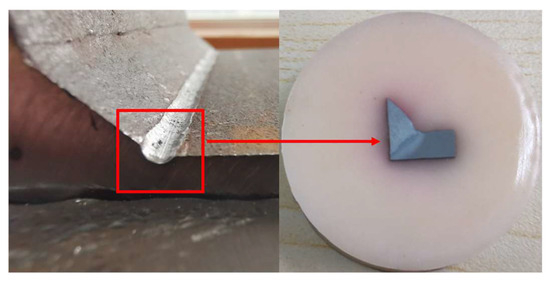 As shown in Figure 12, after the processing was completed, the corresponding method was utilized to prepare the sample for observing the microstructure of the processed area. The microstructure sample was L-shaped, with a length and width of 20 mm and a thickness of 10 mm. The sample was prepared perpendicular to the processing direction, and the cross section should include the area that underwent ultrasonic impact treatment. Prior to observing the microstructure, it is necessary to grind the cross section using sandpaper in the order of 400 #, 600 #, 800 #, and 1000 #, followed by polishing with a black damping cloth using SiO2 suspension until the scratches disappear; then, polishing with silk velvet cloth using water until the specimen changes color, and subsequently corroding it with a specific reagent. Optically, clear grain boundaries can be observed under a microscope, and metallographic photos of each zone can be taken.