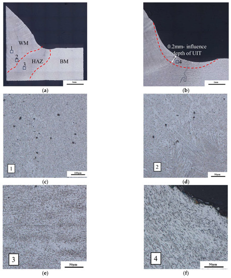 The metallographic samples were observed using an OLYMPUSDSX510 optical digital microscope to analyze the effect of UIT on the microstructure of the joints. Figure 13 illustrates the microstructure of the S355J2 steel-welded joint. It can be found that the welded joint of fusion welding is mainly composed of weld metal (WM), heat-affected zone (HAZ), and base metal (BM), as shown Figure 13a. HAZ consists of two distinct zones, namely, coarse grain HAZ (CGHAZ) and fine grain HAZ (FGHAZ) [33]. Figure 13b illustrates that the depth of UIT’s influence on this welded joint is approximately 0.2 mm.