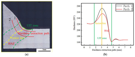 According to the hardness curve in Figure 14b, from the hardness curve of path 2, it can be observed that the HAZ in the lower right of the fusion line exhibits a softening behavior, and the hardness decreases by approximately 10%. Comparing the hardness curves of paths 1 and 2, it is possible to observe the influence of UIT, in which hardness increased by approximately 10%, and reaching the maximum value being around 278 HV near the fusion line.