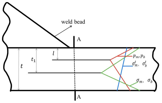 Next, an analysis of the structural stress at the weld toe of the specimen with a plate thickness of and a crack depth of caused by the notch was conducted, as shown in Figure 17. The overall structure is in a self-balancing state at the cross-section A-A, and equivalent stresses and are defined on the crack surface. Assuming that the self-balancing stress caused by the gap can be calculated based on any crack depth l using the principle of equilibrium, the equivalent stresses represented by and can be redistributed and calculated using in another cross-sectional area (at a given gap depth ), thus obtaining the equivalent structural stress at the crack notch. The calculation formula is as follows: