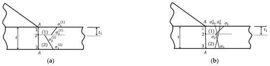 The above only provides the calculation formula for , . However, the calculation of , requires introducing a bilinear distribution with characteristic depth to estimate the equivalent stress of the self-balancing part (dashed line) under the stress state. Figure 18a, and Figure 18b shows the stress distribution of the self-balancing part, which can be considered as two linear distributions in regions 1 and 2, respectively. By conducting equilibrium conditions and traction continuity at point 2, the following formula can be obtained [35,36,37,38]: