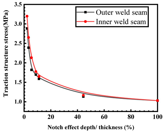 Referring to the traction structure stress curve in Section 4.1 and Section 4.2, the structural stress value of the notch effect depth/thickness () of 15% at 180° is evaluated for a chosen equivalent structural stress coefficient of 1.35.