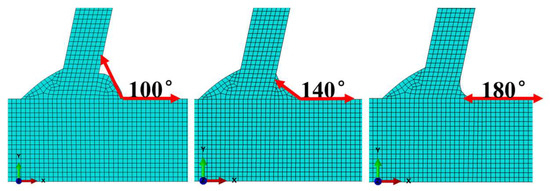 Under UIT, the weld toe morphology of the T-joint specimens changes, forming an arc-shaped notch, and the geometric transition is smoother. We overlooked the change in thickness and focused on studying the impact of the rounding radius of the face transition into the native material (transition angle). Therefore, by changing the transition angle, the effect of UIT on the structural stress at the weld toe of the joint is studied. In this section, three FE models with different weld profiles are used to study. As shown in Figure 21, the transition angles between the weld zone and the base metal are 100°, 140°, and 180°, respectively. The transition angle of 180° is similar to the morphology of the weld toe after UIT.