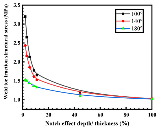 As the ratio increases, the structural stress at the weld toe at different transition angles decreases and finally tends to be consistent. When is less than 15%, the structural stress at the weld toe decreases with the increase in the transition angle, and the trend is obvious. In addition, when the transition angle is 180°, the structural stress of the weld toe is the minimum, indicating that the UIT can effectively reduce the traction structural stress at the welded toe; when is 15%, the structural stress is 1.8 MPa when the transition angle is 100°, 1.6 MPa when the transition angle is 140°, and 1.35 MPa when the transition angle is 180°. If is greater than 15%, with the increase in the ratio, the traction structural stress of the weld toe under different transition angles gradually stabilizes and, finally, tends to be consistent. When =1—that is, when the given crack depth reaches the specimen thickness—the structural stress of different transition fillet toes reaches the minimum value. The structural stress is 1.029 MPa when the transition angle is 100°, 1.027 MPa when the transition angle is 140°, and 1.024 MPa when the transition angle is 180°. With the increase in the rounding radius of the face transition into the native material, the fatigue performance becomes superior due to the decrease in stress concentration factor.