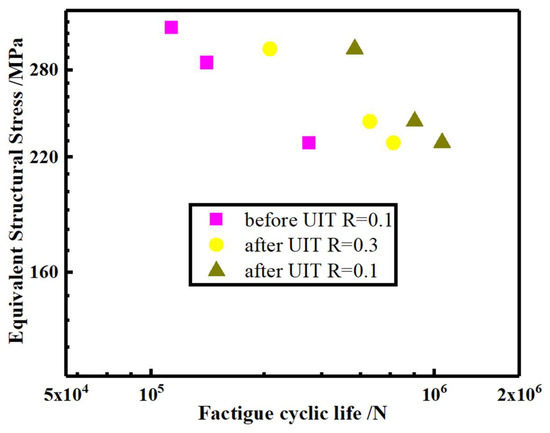 Figure 23 depicts the equivalent structural stress S-N curve of the test specimens before and after UIT. The curve indicates that UIT significantly enhanced the fatigue performance of the specimen by approximately 350% according to fatigue results with a stress ratio of 0.1. The fatigue life of test specimens with a stress ratio of 0.1 is 150% higher than that of test specimens with a stress ratio of 0.3. Additionally, the fatigue life of the specimens with a stress ratio of 0.3 after UIT surpassed that of the original welded specimens with a stress ratio of 0.1, showing an increase of approximately 200%.