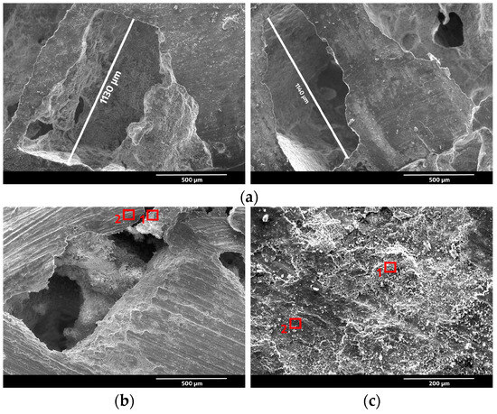 To confirm the open-cell structure of the composites, we performed SEM analysis, as presented in Figure 1a. The SEM images showed that the composites had a porous structure and that the pores were mainly distributed between the size of the NaCl particles, i.e., 1000–1200 µm. Based on the SEM image of the contact surface shown in Figure 1b of the open-cell AlSn6Cu-SiC composite subjected to wear at a load of 50 N, the wear mechanism was mainly abrasive wear. It occurs when hard particles or asperities on sliding surfaces cause material removal by ploughing or cutting. Therefore, the steel counterbody acted as an abrasive agent and caused damage to the softer composite. Its surface roughness of 1.6 Ra could have also contributed to the abrasive wear by creating more contact points and friction between the sliding surfaces. The EDS analysis shown in Table 2 shows that zone 1 (Figure 2a) had a high concentration of Si and C, which indicates that it was a SiC particle. Zone 2 (Figure 2b) had a high concentration of Al and a low concentration of Sn, which indicates that it was part of the AlSn6Cu matrix. The SiC particles located in zone 1 presented in Figure 1a could reduce the mass loss of the composite by acting as a barrier to prevent the penetration and ploughing of the steel disk in addition to being a reinforcement to support the cell walls of the matrix and reduce its deformation. Based on the SEM image of the contact surface shown in Figure 1c of the open-cell AlSn6Cu-SiC composite subjected to wear at a load of 100 N, the wear mechanism was mainly abrasive wear. The EDS analysis shown in Table 3 shows that zone 1 (Figure 2c) had a moderate concentration of Si and C, which indicates that it was a SiC particle. Zone 2 (Figure 2d) had a low concentration of Si and C and high concentrations of Fe from the counterbody and Al from the matrix of the composite, which indicates that it was part of the AlSn6Cu matrix. The SEM images show that the composite had more scratches, grooves, and debris on its surface at higher loads, as shown in Figure 1c, which indicate that there was more material removal by abrasive wear. A pore could be seen on the surface of the AlSn6Cu-SiC composite after conducting the pin-on-disk test at a load of 50 N (Figure 1b) but not after conducting the test at a load of 100 N (Figure 1c). This was because the load affected the wear behavior of the composite, which influenced its surface morphology. As the load increased, the wear depth increased, which resulted in more material removal and more wear debris formation. The wear debris could accumulate on the surface and form a layer of compacted material, which could cover or fill the pores. The wear debris could also act as a third-body abrasive and cause more damage to the surface. The increased load also caused more contact pressure and friction between the sliding surfaces, which resulted in a higher temperature and wear rate. The higher temperature and wear rate could degrade the lubricating effect of the Sn phase and expose the harder SiC particles, which could increase the COF of the composite.