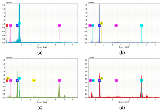 EDS spectra of open-cell AlSn6Cu-SiC composite after conducting tribological tests at different loads: (a) related to contact zone shown in Table 2, analysis 1, at load of 50 N; (b) related to contact zone shown in Table 2, analysis 2, at load of 50 N; (c) related to contact zone shown in Table 3, analysis 1, at load of 100 N; and (d) related to contact zone shown in Table 3, analysis 2, at load of 100 N.