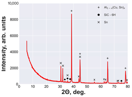 The phases in the composite matrix and the SiC particles were identified by XRD analysis. A powder X-ray diffractometer (BRUCKER Co., Karlsruhe, Germany) with a LynxEye solid-state position-sensitive detector and Ni-filtered Cu Kα radiation was used for this purpose. The XRD patterns were recorded in the 2θ range of 20° to 80° with a step size of 0.02° and a scan speed of 0.5°/min. The phase analysis was conducted using the 2021 release of the PDF-2 ICDD database and the DiffracPlusEVA software package (https://www.bruker.com/en/products-and-solutions/diffractometers-and-x-ray-microscopes/x-ray-diffractometers/diffrac-suite-software/diffrac-eva.html).