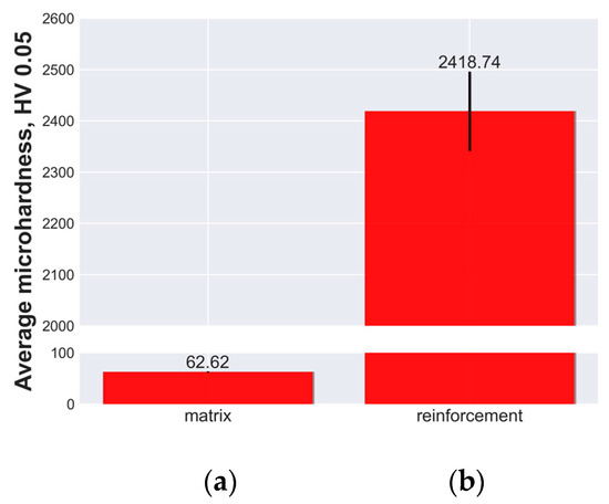 The cross-sections of the materials were tested for their average Vickers hardness (HV) using a force of 0.05 kg·f for 10 s and holding it for another 10 s, as shown in Figure 4. The results showed that the matrix of the open-cell AlSn6Cu had a microhardness value of 62.92 HV, while the reinforcement of the open-cell AlSn6Cu-SiC composite had a microhardness value of 2418.74 HV.