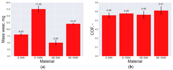 The pin-on-disk method was used to perform the wear tests under dry-sliding conditions at room temperature with a sliding speed of 1.0 m∙s−1 and a sliding distance of 420 m. The materials tested were the open-cell AlSn6Cu material and the open-cell AlSn6Cu-SiC composite. The wear parameters measured were the mass loss and COF, which provided quantitative measures of the tribological behavior of the materials. Figure 5 displays the outcomes of the wear tests.