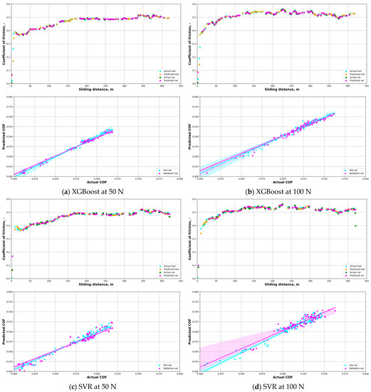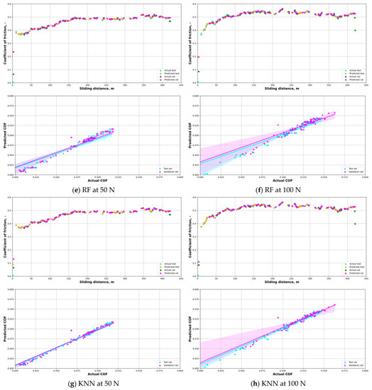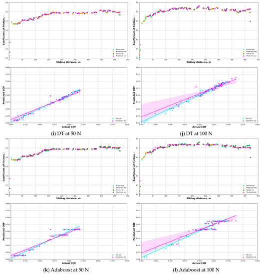 ML models used for prediction of the COF of open-cell AlSn6Cu-SiC composite at different loads: (a) XGBoost at 50 N; (b) XGBoost at 100 N; (c) SVR at 50 N; (d) SVR at 100 N; (e) RF at 50 N; (f) RF at 100 N; (g) KNN at 50 N; (h) KNN at 100 N; (i) DT at 50 N; (j) DT at 100 N; (k) Adaboost at 50 N; and (l) Adaboost at 100 N.