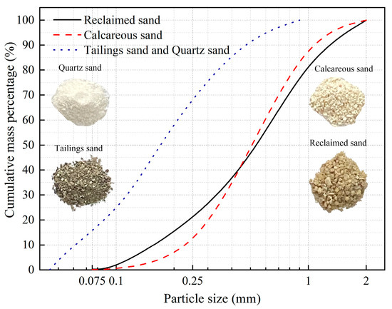 Tailings sand was sourced from the tailings dam of the Makeng Mine in Longyan, Fujian, China. Calcareous sand was collected from a reef in the South China Sea. reclaimed sand was obtained from the construction site of the Dadeng Reclamation Project in Xiamen, Fujian, China. A mixture of quartz sand with diverse particle sizes was prepared to match the particle distribution found in tailings sand. Figure 1 displays the particle size distribution curves and shapes for the four sand types. The minimum and maximum dry densities as well as pH of the four sands were determined according to Standard for Geotechnical Testing Method (GB/T 50123-2019) [27]. The main components of the four sands were analyzed using chemical analysis methods, and the results are shown in Table 1.