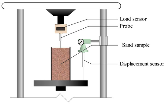 Referencing the method by M. A. Rice et al. [31] used to evaluate the abrasion resistance of crusts through a penetration resistance test, an improved micro-penetration device was used for the syringe sand samples (as shown in Figure 3) to simultaneously evaluate the reinforcement strength and uniformity. The improved micro-penetration device consists of a TSZ-3 strain-controlled triaxial tester, a load sensor (measuring range: 0~200 N), a probe (diameter: 3 mm), and a displacement sensor (measuring range: −25~25 mm). Before testing, the probe was placed directly above the center of the sand sample’s surface, and the strain rate was set at 4 mm/min. Both the penetration resistance and penetration depth of the probe were recorded with the load sensor and displacement sensor placed vertically. Data were recorded using the DH3816N static strain testing system.