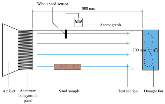 Dish sand samples were placed in a small-scale wind tunnel model (as shown in Figure 4) and subjected to different wind speeds: 4, 6, 9, and 12 m/s. After 1 h of exposure, the mass loss due to wind erosion was measured for each sand sample.