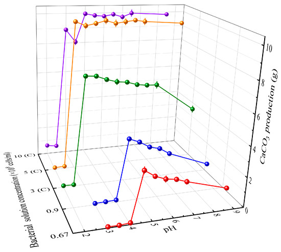 Figure 5 illustrates the calcium carbonate content generated after 7 days of reaction with bacterial solutions of different concentrations and pH levels and the cementation solution, with the original bacterial solution’s pH set at 8.5. The change in pH values of the bacterial solutions is graphically presented in Figure 6, encompassing the periods before and after the reaction.