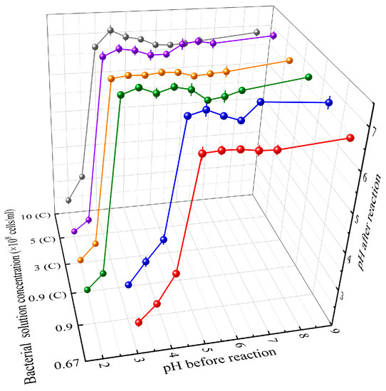 In these figures, the concentrations are represented by 0.67, 0.9, 3, 5, and 10, corresponding to 0.67 × 108, 0.9 × 108, 3 × 108, 5 × 108, and 10 × 108 cells/mL bacterial solution concentrations, respectively. It can be observed that both the calcium carbonate production and the post-reaction pH undergo a sudden change around a specific pH value. This specific pH is defined as the lowest tolerable pH value. When the pH of the bacterial solution drops below this lowest tolerable pH value, calcium carbonate precipitation is almost non-existent (Figure 5), and the pH of the bacterial solution remains nearly unchanged before and after the reaction (Figure 6). Because, at a lower pH (lower than pKa1 of carbonate system: 6.35), the chemical equilibrium of carbonate systems is displaced to H2CO3 and forms, it is very difficult to precipitate CaCO3. At this moment, the urease activity is very low and the amount of OH− produced by decomposing urea is low, which has little effect on the pH of the carbonate system. So, urease gradually becomes completely inactive under long-term inhibition in a low-pH environment and the MICP process cannot proceed normally.