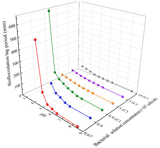 (1) Low pH can delay the flocculation of calcium carbonate. Within the tolerated pH range, lower bacterial solution pH leads to more calcium carbonate generation and a longer bioflocculation lag period. Higher bacterial solution concentration results in more calcium carbonate production but a shorter bioflocculation lag period. The optimal theoretical reaction pH values for bacterial solution concentrations of 0.67 × 108, 3 × 108, and 10 × 108 cells/mL are 4.5, 3, and 4, respectively;