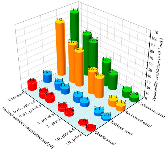 After MICP treatment, the permeability coefficients of the sand samples were significantly reduced, with higher bacterial concentrations leading to more pronounced reductions. Furthermore, samples treated with low-pH bacterial solution exhibited more significant reductions in permeability coefficients compared to samples treated with pH-unadjusted bacterial solution. This is attributed to the fact that low-pH bacterial solution induces the formation of more and evenly distributed calcium carbonate, which improves the pore-filling effect and reduces permeability.