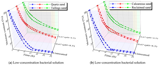 It is worth noting the substantial differences in the effect of the two treatment methods on calcareous and tailings sands. This could be attributed to the presence of calcium salt in these two sands, which provides additional calcium sources. Under the influence of the low-pH lag period, more effective calcium carbonate is generated, enhancing consolidation. At a bacterial concentration of 0.67 × 108 cells/mL, the trends in permeability changes for the four sands after MICP treatment remained consistent with the pre-treatment characteristics. However, for bacterial concentrations of 3 × 108 and 10 × 108 cells/mL, the permeability coefficient of calcareous sand was lower than that of reclaimed sand after MICP treatment under low-pH conditions. This is due to the presence of additional calcium sources and the larger porosity of calcareous sand, resulting in deeper and more uniform permeation when bacterial concentrations are sufficient, leading to better calcium carbonate precipitation and uniformity compared to reclaimed sand. At a bacterial concentration of 0.67 × 108 cells/mL, the effect was less pronounced due to insufficient bacterial concentration.