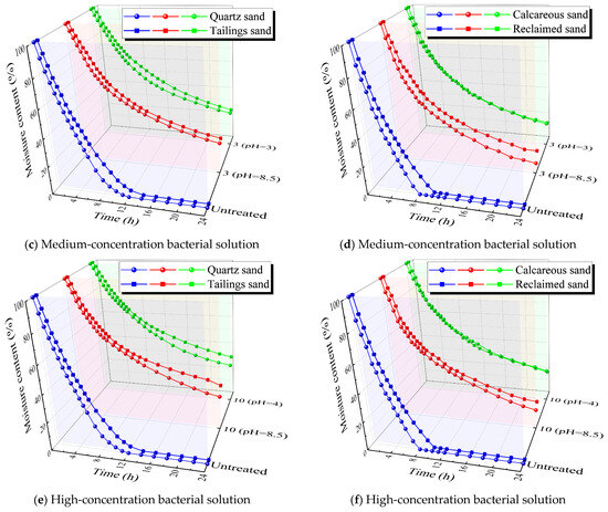 Figure 9 illustrates the variation in moisture content over time before and after MICP treatment for the four types of sands. The initial moisture retention properties were ranked as follows: tailings sand > quartz sand > reclaimed sand > calcareous sand. The first two sands are fine-grained, characterized by small pores, resulting in significantly higher moisture retention compared to the coarse sands. Tailings sand contains calcium oxide, which imparts a certain water-absorbing capability, leading to higher moisture retention than quartz sand. calcareous sand contains fewer fine particles and more coarse particles, resulting in larger pores compared to reclaimed sand, thus exhibiting lower moisture retention.