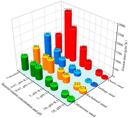 Furthermore, the erosion mass of tailings sand treated with a low-pH bacterial solution at a concentration of 10 × 108 cells/mL was reduced to zero, highlighting the superior raindrop erosion resistance of tailings sand among the four types of sands after reinforcement.