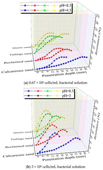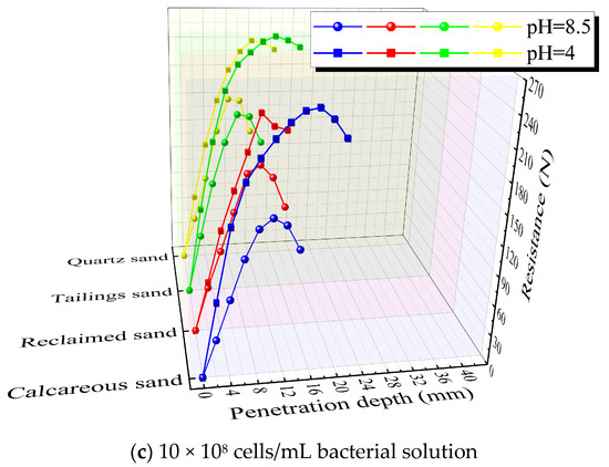 At a concentration of 10 × 108 cells/mL, the effective reinforcement depth achieved with the low-pH method is larger compared to the pH-unadjusted method for the same type of sand, and the strength is stronger. This is due to the higher bacterial concentration resulting in sufficient calcium carbonate production, leading to high compactness in both methods and, thus, increasing the strength with effective reinforcement depth. The patterns for sand reinforcement with pH-unadjusted bacterial solution remain consistent with those mentioned earlier. However, the effective reinforcement depth and strength patterns for sand reinforcement with low-pH bacterial solution differ slightly. This is attributed to the high bacterial concentration, which results in insufficient calcium sources in the cementation solution. Therefore, sands like tailings sand and calcareous sand, which can provide additional calcium sources, exhibit greater strength and effective reinforcement depths compared to the other two sands. Furthermore, smaller particle sizes lead to denser reinforcement, resulting in a strength ranking as follows: tailings sand > calcareous sand, with quartz sand > reclaimed sand, in terms of strength.