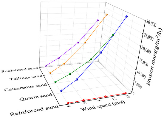 Figure 12 illustrates the wind erosion mass per unit area for the four types of sand. Prior to reinforcement, the wind erosion mass followed the order: quartz sand > tailings sand > reclaimed sand > calcareous sand. Smaller and lighter sand particles are more susceptible to being carried away by the wind. At a wind speed of 12 m/s, the wind erosion mass of both tailings sand and quartz sand could reach nearly 30 kg/m2/h. However, after reinforcement using any method and any concentration, the wind erosion mass for all four types of sand was reduced to zero. This indicates that the MICP-treated sand exhibits exceptional resistance to wind erosion.