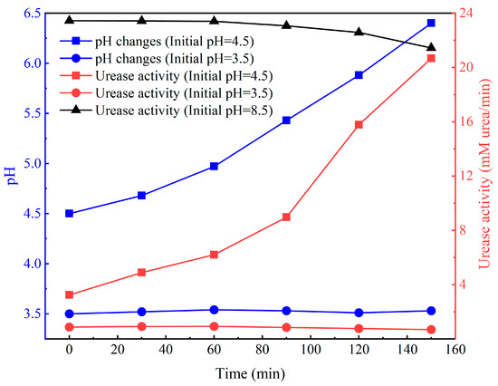 To further investigate the impact of pH variations on urease activity during low-pH MICP reactions, a scenario using a bacterial solution of 0.67 × 108 cells/mL was considered. Two sets of experiments were conducted using bacterial solutions with pH values of 3.5 (below tolerance pH) and 4.5 (minimum tolerance pH) mixed with the cementation solution. The pH of the mixed solution was measured every 30 min, and the results are represented by the blue curve in Figure 13. It is observed that when using an initial pH of 4.5 for the bacterial solution, the pH gradually increased during the reaction process, reaching 5.88 after 2 h and 6.4 after 2.5 h. On the other hand, when using an initial pH of 3.5 for the bacterial solution, the pH remained relatively stable after being mixed with the cementation solution. This observation aligns with the findings in Figure 6 of Section 3.1.
