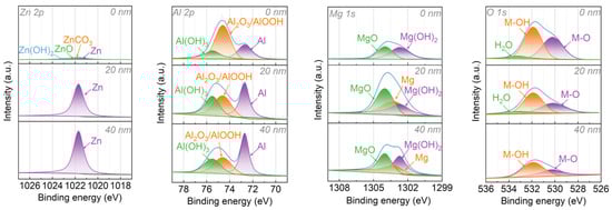 XPS utilizes monochromatic Al Ka radiation (hv = 1486.6 eV, 225 W) as the X-ray source, and all spectra are calibrated by C 1s (284.8 eV). Utilizing XPS analysis equipment and argon ion etching, the valence and content changes of surface elements in the Zn–Al–Mg steel plates at different depths were studied. Figure 1 illustrates the XPS analysis results of the original surface of the Zn–Al–Mg steel plate after etching at 20 and 40 nm. According to Figure 1, as the etching depth increases, the oxygen content decreases, and Al and Mg gradually change from hydroxide to oxide and metal. Simultaneously, Zn changes from hydroxide and oxide to metal. The steel plate underwent pit leveling during the manufacturing process, and several micrometer-deep pits are present on its surface, which has a certain impact on the XPS etching fault analysis. However, the overall analysis results are reasonable, indicating a large amount of hydroxide on the surface of the Zn–Al–Mg steel plate.