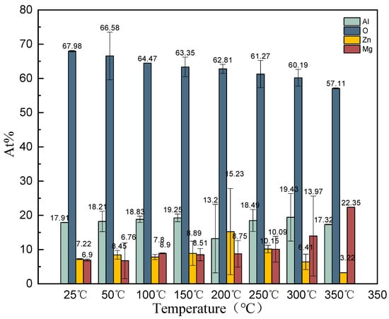 Changes in the Zn, Al, Mg, and O contents on the surface of the Zn–Al–Mg steel plates after different temperature treatments were investigated using XPS, and the results are illustrated in Figure 2. The vertical axis in Figure 2 represents the proportion of atoms in each element (at.%), whereas the horizontal axis represents the different processing temperatures. The XPS analysis results demonstrate that the atomic content of O on the surface of the Zn–Al–Mg steel plate was extremely high. As the heat temperature increased, the atomic O content decreased gradually. Before and after heat treatment, the atomic content of Zn did not change significantly, whereas the atomic proportions of Al and Mg increased with the treatment temperature. The loose layer was composed of magnesium hydroxide and aluminum hydroxide. As the heat treatment temperature increased, the hydroxide dehydrated and transformed into an oxide. O was lost in the form of water molecules, and the atomic proportions of Al and Mg increased. The atomic proportion of Zn in the Zn–Al–Mg steel plate did not change, thus indicating a relatively low content of zinc hydroxide in the loose layer. Therefore, the atomic proportion of Zn did not change significantly before and after the heat treatment. This indirectly indicates that the Mg and Al in the Zn–Al–Mg steel plates were first oxidized as sacrificial elements and formed a loose layer to protect the steel plate from further oxidation.