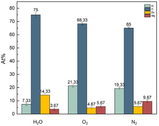 Figure 3 illustrates the atomic content ratios of the main elements on the surface of clean Zn–Al–Mg steel plates, as determined via XPS under N2, O2, and H2O atmospheres. Theoretically, under an N2 atmosphere, oxidation does not occur on the surface of the Zn–Al–Mg steel plates; however, the O content was extremely high, thus indicating that oxidation had already happened during the preparation of clean Zn–Al–Mg steel plates. Water cleaning was performed to prepare clean Zn–Al–Mg steel plates. Although the operation time was short, some oxidation reactions were observed in the XPS results. Figure 3 demonstrates that after 48 h in N2, O2, and H2O atmospheres, the elemental content on the surface of the Zn–Al–Mg steel plates changed significantly. The atomic content of O in the H2O and O2 atmospheres was substantially higher than that in the N2 atmosphere, indicating that O2 and H2O vapors significantly affected the formation of loose layers. Moreover, the loose layer formed on the surface of the Zn–Al–Mg steel plates via water vapor was thicker than that formed in an O2 atmosphere. The atomic proportion of O2 on the surface of clean Zn–Al–Mg steel plates under a H2O vapor atmosphere was the highest, i.e., 75%.