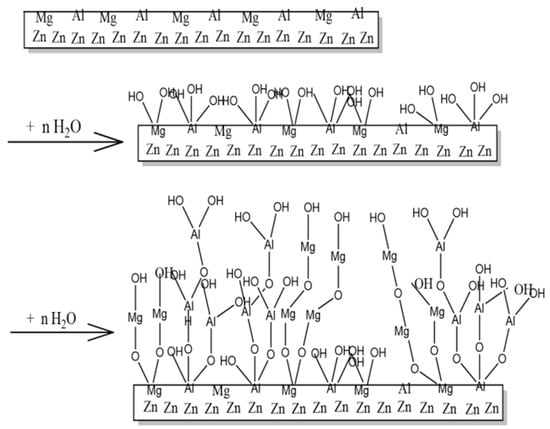 The surface O content of the Zn–Al–Mg steel plate under the O2 atmosphere was higher than that under the N2 atmosphere; however, it was not comparable to the increase in O content under the H2O atmosphere, indicating that the formation of loose layers was mainly due to H2O. A schematic of the reaction between active Al and Mg on the surface of the Zn–Al–Mg steel plate and H2O in the air to generate hydroxides is illustrated in Figure 4. The metal and H2O in the air underwent a single displacement reaction [M + 2H2O = M(OH)2 + H2] to generate magnesium hydroxide and aluminum hydroxide sacrificial layers. A single displacement reaction of H2O occurred on the Zn–Al–Mg steel plate’s surface, forming a loose layer of flake hydroxide. Although this hydroxide layer is loose, a loose layer with a thickness of several nanometers is sufficient to prevent further single-displacement reactions and corrosion on the steel plate.
