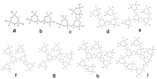 ). After hydrolysis, the silane coupling agent formed a polymer structure. A silane coupling agent with a 1–9 ring structure is illustrated in Figure 9 (where R = CH2CH2CH2NHCH2CH2NH2). In the different aggregates, the T2 and T3 types of Si constituted different proportions of the integrated area. Figure 9a illustrates that Si exhibited only the T2 structure. Meanwhile, Figure 9b illustrates T2:T3 = 4:2; Figure 9c, T2:T3 = 5:4; Figure 9d, T2:T3 = 6:6; Figure 9e, T2:T3 = 7:8; Figure 9f, T2:T3 = 8:10; Figure 9g, T2:T3 = 9:12; Figure 9h, T2:T3 = 10:14; and Figure 9i, T2:T3 = 11:16. These hydrolysis structural ratios demonstrate that the higher the proportion of the T3 integral area in the 29Si spectrum, the larger the aggregate hydrolyzed by the silane coupling agent. Therefore, the molecular weight of the silane coupling agent after hydrolysis was determined by using 29Si-NMR spectroscopy.