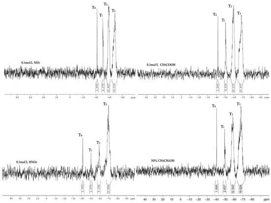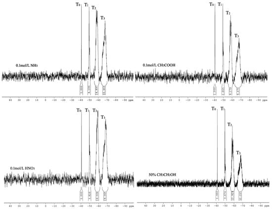 29Si-NMR spectra of silane coupling agent hydrolysate with Si element content of 2.4 × 104 ppm under different hydrolysis medium conditions.