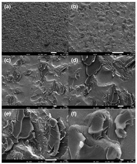 SEM image of surface of modified Zn–Al–Mg steel plate after epoxy resin bonding ((a–f) represent different magnifications).