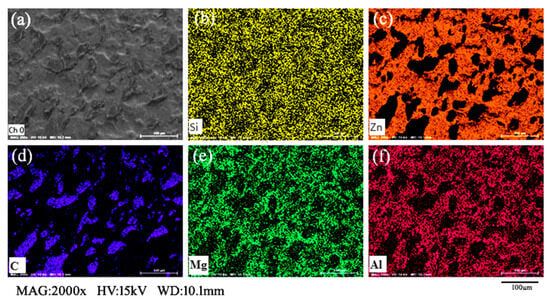 SEM-EDS result illustrating element distribution on surface of modified Zn–Al–Mg steel plate after epoxy resin bonding ((a) is the SEM diagram; (b–f) illustrate the element distributions of Si, Zn, C, Mg, and Al, respectively).