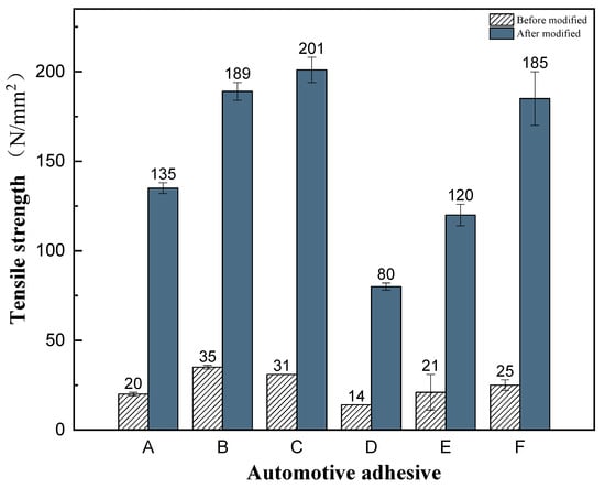 Tensile and shear strength of Zn–Al–Mg steel plate and vehicle adhesive before and after modification (A, B, C, D, E, and F represent different brands of commercial automotive adhesives).