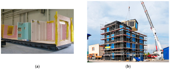 Example of realisation of a multi-storey building from modular elements: (a) prefabrication of modules in a factory and (b) assembly of a building from modular elements on a construction site.