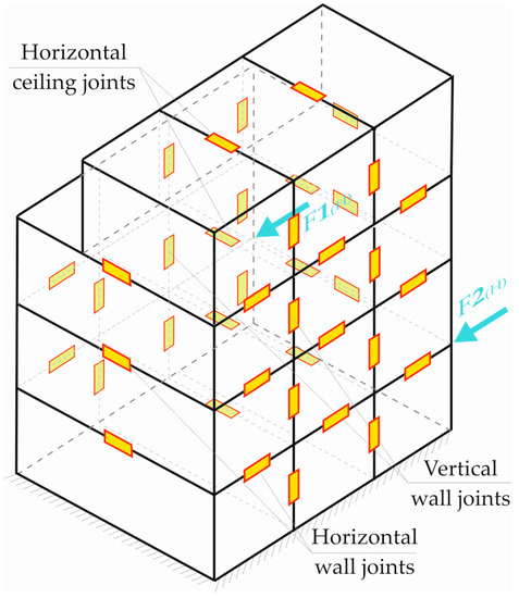 One of the requirements for the exploitation of this type of building is its stiffness, especially for horizontal loads, which largely depend on the inter-module connections [6,7]. An example of the location of such inter-module connections is shown in Figure 2.
