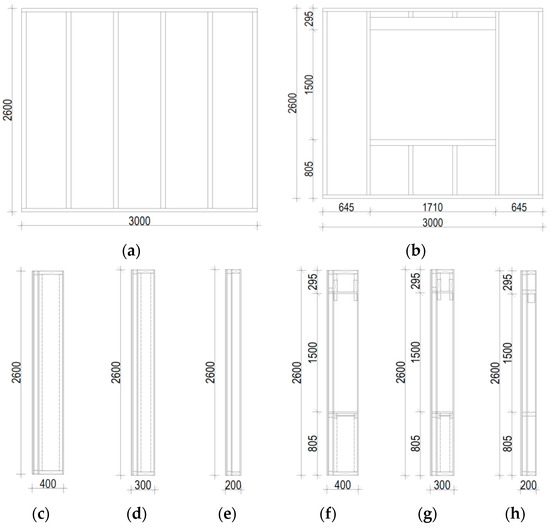 Tested wall panels [38]: (a) panel without openings, (b) panel with an opening, (c) section of the SZA wall without openings, (d) section of the SZB wall without openings, (e) section of the SZD wall without openings, (f) section of the SZA wall with an opening, (g) section of the SZB wall with an opening and (h) section of the SZD wall with an opening.