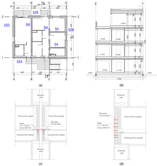Plan and cross section of the tested building and module connection diagrams [39]: (a) ground floor plan, (b) vertical section, (c) horizontal connections between modules and (d) vertical connections between modules.