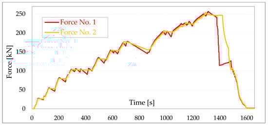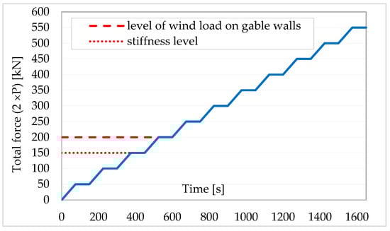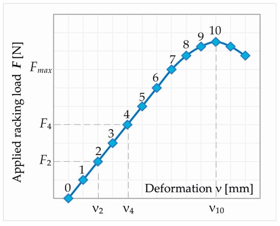 The load was applied in a horizontal direction with a multi-channel hydraulic system dedicated to structural loads application (HYSDOZOK). The tests used one of the available hydraulic cylinders (with a loading range of ±200 kN). The force increment during the test was 5 kN every 30 s. The loading process was continued until the wall failed (Fmax) [38].