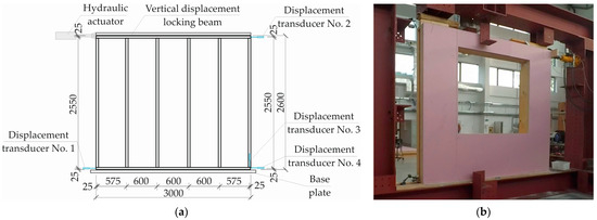 Destructive testing of wall panels was conducted in the laboratory hall of the Faculty of Civil Engineering and Environmental Sciences of Bialystok University of Technology [38]. Wall panels were fixed to the experimental test rig shown schematically in Figure 6a. A wall panel with an opening during testing is shown in Figure 6b.