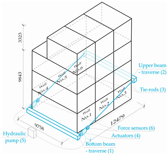 The load application system used was meant to apply horizontal loads on the building from the gable wall side and to implement assumed loading in stages (Figure 8). Loads were applied through traverse beams (1–2) placed at the level of the building foundation and at the level of ceiling above the ground floor, respectively. Traverses (1–2) were connected with tie rods (3). Loads were applied with hydraulic actuators (4) placed symmetrically on tie rods on both sides of the building. Hydraulic actuators were powered by a hydraulic pump (5).
