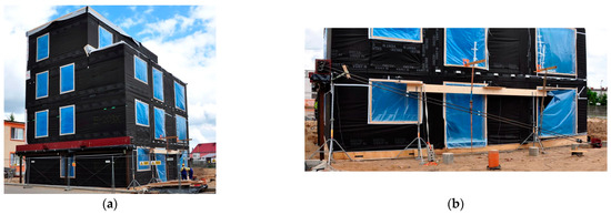The building’s structure was constructed using timber-frame technology. It is a four-storey building realised by Unihouse SA [36], a leading manufacturer of wooden buildings in Poland. Every storey comprises three modules. One of the modules is designed as a one-bedroom studio. Another two modules are combined to form a two-bedroom flat.