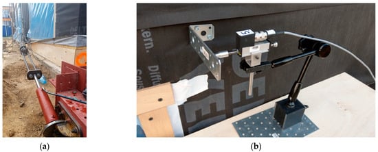 As can be seen in Figure 6a, transducers No. 1, 2 and 4 were mounted to measure horizontal displacements in the plane of the wall. The task of displacement transducer No. 3 was to measure vertical displacement in the plane of the wall, taking into account the compression of the wall to the base plate.