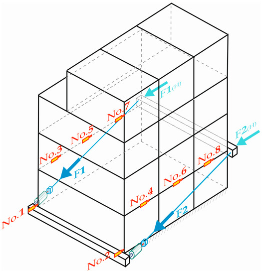 Displacement transducers marked as No. 1 and No. 2 were placed directly above the foundation of the building, from the north-eastern side. Transducers No. 3 to No. 8 were placed around 30 cm above window lintels. The location of potentiometric linear transducers with its numeration (marked from No. 1 to No. 8) is shown schematically in Figure 11. In the figure below, the location of hydraulic actuators is marked as F1 and F2.