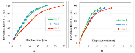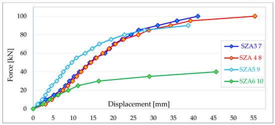 Figure 13 shows an example of force–displacement diagrams obtained during testing of Type A external wall panels (designation SZA). Only the horizontal displacements in the plane of the panel recorded using displacement transducer No. 2 are summarised in the figure.