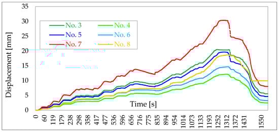 The displacements values of the tested building are not that high and range from a few to several tens of millimetres (maximum 29.3 mm). For the wind load level (according to Figure 12 approximately 75 kN), the displacement values of the walls, on the left and right sides of the building, are between 2.5 to 5.2 mm (Figure 16). At the so-called stiffness level (according to Figure 12 about 100 kN), the displacements values are around 3.8–7.1 mm (Figure 16).