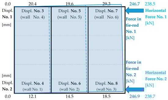 A diagram of the forces in the tie rods during the building tests is shown in Figure 14 and a diagram of the displacements of individual walls is shown in Figure 15.